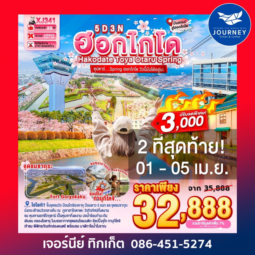 | 3 | เมืองฮาโกดาเตะ – ตลาดเช้าฮาโกดาเตะ – โกดังอิฐแดง – ย่านเมืองเก่าโมโตมาชิ – ป้อมโกเรียวคาคุ (เข้าชม) – ทะเลสาบโทยะ – ออนเซน **บุฟเฟต์นานาชาติ** | TOYA SUN PALACE RESORT & SPA, TOYA หรือเทียบเท่า 3 ดาว | |||